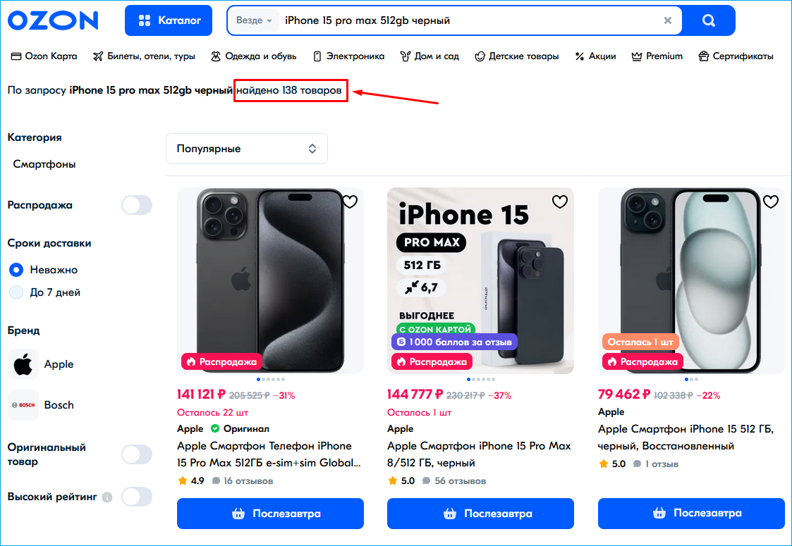 – По модели товара. Иногда, выдача предлагает аналогичные или очень похожие товары (например модели iPhone 15, 15 Pro и 15 Pro Max – три абсолютно разных устройства);