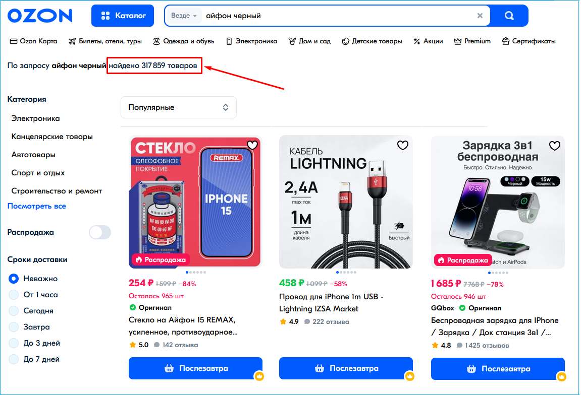 - При поиске определенных товаров, лучше вбивать не “айфон черный”, где в выдаче будет все подряд – от самих телефонов до чехлов и аксессуаров к ним, а “iPhone 15 pro max 512gb черный”, где есть более узкий и точный запрос.