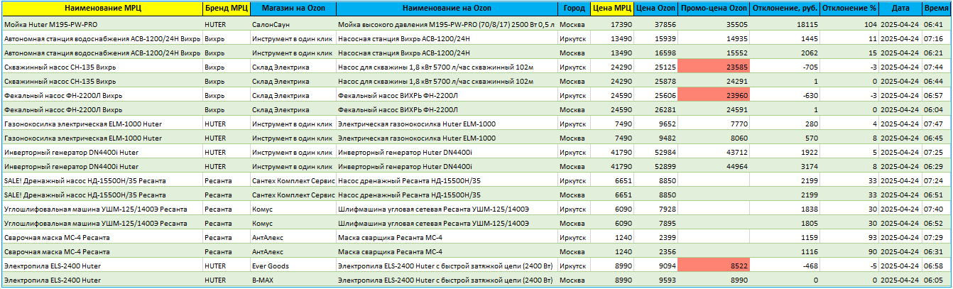 – Отклонения в рублях и процентном соотношенииПример мониторинга на демпинг партнеров или конкурентов. Желтым помечена информация от заказчика